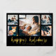 Cette carte de voeux de Noël simple et classique de famille en feuille d'or présente une typographie décontractée et moderne qui dit "Happy Holidays" sur un arrière - plan noir foncé, avec une grille de cinq photos sur le devant et une sur le dos.