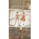Deux danseurs de l'harlequin debonair se produisent gracieusement en costumes vibrants sur fond de régal rouge canneberge, orné de guirlandes dorées décoratives et entouré de délicates notes musicales. Illustration originale de l'artiste Noël Snow.
