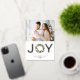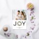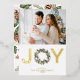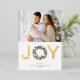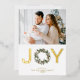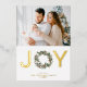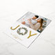 Carte de vacances en or Joy. Cette carte de vacances en or et joy dorés de l'hiver présente de la verdure peinte à la main à l'aquarelle et des pommes de pin disposées en une belle couronne avec une photo de famille. Le dos comprend un motif assorti. Trouvez les articles assortis dans la collection de Noël Pinecone et Greenery Christmas Holiday.