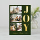 Des cartes de voeux de Noël modernes et élégantes, avec quatre photos de Noël de famille, une épaisse feuille d'or en gras avec "JOY" et une feuille d'or en écriture avec votre nom de famille en vert foncé arrière - plan