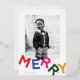 Entrez dans un monde de charme minimaliste et de joie vibrante avec ce design de carte de vacances délicieux. Contre un arrière - plan blanc propre, votre photo personnalisée brille au premier plan, capturant un moment chéri qui incarne l'esprit de la saison. De grandes lettres majuscules joueuses et audacieuses forment le mot "MERRY" sous la photo. Chaque lettre est imprégnée d'une couleur vive différente, créant un affichage visuellement frappant qui rayonne de joie festive. Les lettres colorées dansent joyeusement, invitant les récipiendaires à embrasser le plaisir et l'excitation de la saison des Fêtes. Sous la photo, dans une police sans serif classique et élégante, votre nom de famille et l'année sont gracieusement affichés en noir. Cette touche subtile ajoute une touche personnelle et intemporelle au design, faisant de cette carte un souvenir chéri.