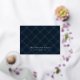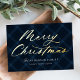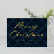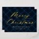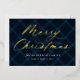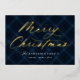 Elégante carte de vacances avec "Joyeux Noël" affichée dans un script de calligraphie de feuille d'or sur un arrière - plan peint de marine plaid. Personnalisez l'avant de la carte de vacances rustique non photo en ajoutant votre nom et l'année. L'arrière de la carte comporte un arrière - plan plaid assorti avec des points de neige blancs subtils.