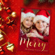 Elégante carte de vacances rouge saisonnière avec votre photo, "Merry" dans un grand script élégant fait de véritable feuille d'or et votre nom et l'année.