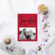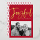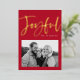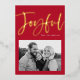 Carte de vacances en feuille moderne avec script "Joyful" en feuille d'or à la main avec un arrière - plan rouge festif. Personnalisez l'avant de la carte en ajoutant votre photo horizontale préférée et votre nom. Le revers de la carte est orné d'un motif de Noël moderne rouge et blanc.
