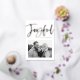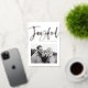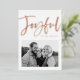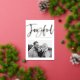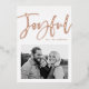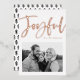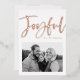 Carte de vacances en feuille moderne avec un script en feuille d'or rose "Joyful" écrit à la main avec un arrière - plan blanc. Personnalisez l'avant de la carte en ajoutant votre photo horizontale préférée et votre nom. Au verso de la carte, un motif de Noël moderne noir et blanc.