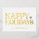 Envoyez des salutations de vacances élégantes et audacieuses aux clients, aux employés et aux partenaires d'affaires avec cette simple carte de Joyeux Fêtes d'entreprise propre. Doté d'une feuille d'or authentique "Happy Holidays" texte sur un arrière - plan blanc personnalisable, ce design respire à la fois le style et le professionnalisme. Personnalisez avec votre logo personnalisé et ajoutez votre message de vacances des deux côtés. L'arrière - plan bleu marine est facilement changeable pour s'adapter aux couleurs de votre marque, et la feuille d'or peut être changée en or rose ou en argent pour une touche unique. Cette carte est un modèle en ligne pratique, permettant une personnalisation transparente pour créer le message saisonnier parfait pour votre bureau et votre réseau professionnel.