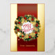 Cette très élégante carte de Noël présente une luxueuse couronne de Noël sur un arrière - plan rouge avec deux vrais bandes verticales en or. La couronne est décorée de cônes de pin, de boules saintes, rouges et blanches, de véritables étoiles dorées et de flocons de neige. Décor très heureux avec le texte Joyeux Noël et le nom de l’expéditeur à customiser. Véritable feuille or. Joyeux Noël!