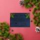 Entreprise affaires feuille d'or fête de noël invitation avec cône de pin et éléments de branche sur marine bleu arrière - plan, ajoutez votre logo d'entreprise personnalisée en feuille d'or fantaisie aussi bien. Moderne, élégant bleu marine aquarelle arrière - plan avec feuille d'or texte de script fantaisie pour accueillir vos employés, collègues et amis avec classe et sophistication cette saison de vacances.