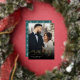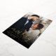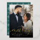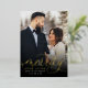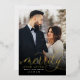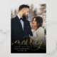 Les cartes photos de vacances élégants pour les jeunes mariés disposent d'une photo mariage verticale ou portrait préférée avec "Merrily Ever After" superposé dans un luxueux script de calligraphie en feuille d'or. Personnalisez avec vos noms ou salutation personnalisée en dessous. Un subtil et moderne motif de flocon de neige à l'envers complète le look. Parfait pour partager une photo mariage pour votre premier Noël de mariage.
