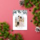 L'élégante carte de faire-part mariage de Noël "Merrier Together" présente un portrait en arc moderne du couple encadré par un bel arrangement de flocons de neige argentés aquarellés et de verdure fleurie hivernale avec baies blanches, vertes et bleues, feuilles d'eucalyptus et branches à feuillage persistant. Personnalisez le texte élégant en papier argenté avec le nom du couple marié et la date du mariage. Une photo supplémentaire avec cadre fleuri habille le dos de la carte.
