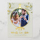 Merrily Ever Après script brossé photo de luxe nouveau marié premier Noël comme M et Mme carte de vacances avec élégant rustique moderne sauge vert et véritable feuille d'or vert et une forme ornementale de Noël. Facile à personnaliser avec 2 photos mariages et votre texte des deux côtés.