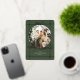 Upload your family photo, enter your family name (like "The Anderson Family"), and add the year. Your photo appears in the elegant circular bow-topped frame on the front. The sophisticated green and gold design, modern script typography, and coordinating tree pattern back are already part of the beautiful layout.