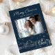 Share the peaceful charm of a winter's night with this stunning holiday card featuring a cozy village scene. The deep navy blue background beautifully contrasts the delightful illustration of snow-covered houses, trees, and stars, all glowing in brilliant silver foil. Your favorite family photo is elegantly framed in the center, while the handwritten-style "Merry Christmas" greeting also shines in matching silver foil, creating a serene and magical announcement.