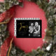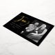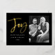 Carte de vacances en feuille moderne avec "Joy" en écriture feuille or à la main avec un arrière - plan noir. Personnalisez l'avant de la carte en ajoutant votre photo verticale préférée, votre salutation personnalisée, votre nom et l'année. Au verso de la carte, un motif de Noël moderne noir et blanc.