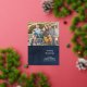 Photo greeting card with contemporary Joy in bright gold script lettering, Modern, elegant navy blue watercolor background with gold foil script text to greet your family and friends with class and sophistication this holiday season. stylish flat greeting card. Design Copyright © www.CustomChristmasPhotoCards.com Sample Image Photography © Storytree Studios, Stanford, CA