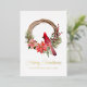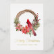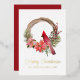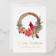 Belle carte plate de vacances d'oiseau cardinal rouge Merry Christmas en script aquarelle élégant sur une couronne de baie de houx. Ces belles cartes de vacances ont un texte de script en feuille réelle. Personnalisez-le et faites-en votre propre. Parfait pour envoyer à vos amis et à votre famille pendant la saison des fêtes.