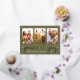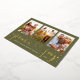 Simple et chic "Peace and Joy" carte photo de vacances comprend un collage de 3 photos de portrait sur une disposition horizontale de carte avec des étoiles scintillantes blanches et texte de script de calligraphie à lettrage manuel mignon et moderne avec accent du coeur dans une véritable feuille d'or. Personnalisez le message d'accueil, la signature de la famille et l'année sur le devant, et choisissez d'inclure un message supplémentaire au verso de la carte. Un espace photo paysager supplémentaire est inclus à l'arrière. La couleur arrière - plan vert olive peut être modifiée.
