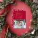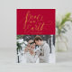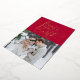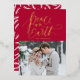 Elégante carte de Noël avec "Paix sur Terre" affichée en haut dans un script en feuille d'or écrit à la main avec votre nom et la photo affichée ci-dessous sur un arrière - plan rouge. Le dos de la carte de Noël en feuille d'or comporte un motif de branches de pin blanc et des points avec un arrière - plan rouge (ou la couleur de votre choix).