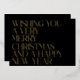 Faites une déclaration audacieuse cette saison des fêtes avec cette carte de Noël élégante personnalisée. Avec son fond noir chic et son texte en feuille d'or luxueuse, la carte dégage de la sophistication et du style. Le devant met en valeur toute la typographie en magnifique feuille d'or, tandis que le verso est réservé à votre photo préférée, créant un contraste saisissant. Parfaite pour ceux qui apprécient l'élégance moderne, cette carte est un moyen intemporel et mémorable d'envoyer vos vœux de fin d'année.