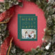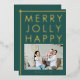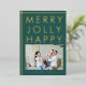 Carte de vacances moderne Joyeux Noël en or à motif de famille heureuse et joyeuse. Joyeux, jovial, heureux en feuille d'or sur fond vert foncé. Ajoutez la photo et le nom de votre famille.