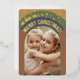 Une carte de style moderne du milieu du siècle muet en terre cuite, vert mousse, bleu brun et jaune moutarde dans un look ultra rétro complète cette carte de portrait photo ancienne. Celui-ci dispose d'un espace voûté pour votre propre photo de famille, et a également un filtre sépia pour antique votre image juste un peu, votre fausse signature en script de feuille métallique le long du côté inférieur droit, juste ajouter votre nom et l'année en cours, qui tombera juste en dessous de celui en impression de papier. Il est presque temps pour l'échange de cartes de vacances de cette année, donc vous serez bien d'aller avec cette carte muette avec des accents de feuille. Il y a un papier à clavier légèrement moucheté qui prend vie avec votre belle photo de famille en ajoutant cette touche finale dans le centre voûté. Un joyeux souhait d'un Joyeux Noël court le long de l'arc en métal sous l'éclat scintillant des étoiles sur le dessus. Vous pouvez changer un peu le message de voeux de vacances s'il y a un autre verset que vous préférez, limité à environ le même nombre de lettres (ou moins). Vous pouvez jouer avec la personnalisation pour voir toute autre modification de libellé qui peut fonctionner pour vous avant de vous engager. Sur le dos, une teinte verte assortie et sobre complète l'avant de la carte. Profitez d'une excellente saison de vacances !
