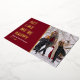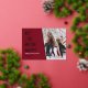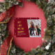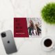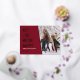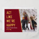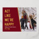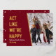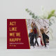 Carte de Noël en véritable feuille métallisée avec une photo de famille, un fond rouge traditionnel profond, la phrase humoristique "faites comme si nous étions heureux", vos vœux chaleureux et le nom de la famille.