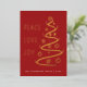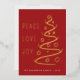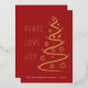 Une élégante carte de vacances moderne présente un arbre abstrait d'art avec PEACE LOVE JOY en feuille d'or sur une carte rouge. Personnalisez avec votre nom de famille.