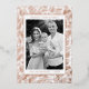 Carte de vacances en feuille moderne avec votre photo encadrée en blanc avec un motif géométrique en feuille d'or rose. Personnalisez le front avec votre salutation de vacances personnalisée, nom de famille, et année en lettres roses en or gras. Le dos de cette carte de Noël unique comprend de l'espace pour votre message personnel en lettres noires sur un arrière - plan blanc.