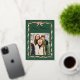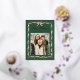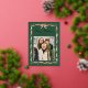 Partagez vos vœux de fête avec cette élégante carte de Noël en papier doré représentant une guirlande de verdure aquarelle et un ruban rouge classique sur un fond riche de couleur vert sapin. Le recto met en valeur votre photo préférée, accentuée de « Joyeux Noël » en écriture fantaisiste en dorure à la feuille et votre nom de famille juste en dessous. Le verso poursuit le design vert foncé avec une deuxième photo et un espace pour votre message de vacances personnalisé, créant un souvenir intemporel recto-verso avec des détails classiques de ruban et de verdure.