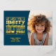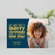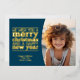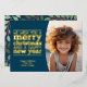 motif bleu botanique. Un salut en feuille d'or - Nous vous souhaitons un Joyeux Noël et un Joyeux Nouvel An - est sur le côté de la photo. La photo est une légère courbe en arc avec un endroit pour ajouter une signature de famille. Le design du dos comprend un motif botanique de Noël dans des bleus gais et vert pour un look classique.