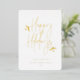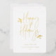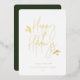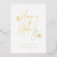 Joyeuses Fêtes, scénario tout simplement festif avec accents de feuillage, typographie à feuille d'or véritable. Cadre photo carré unique avec espace de modèle pour votre message de vacances personnel au dos avec fond vert foncé.