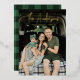 Carte de vacances moderne avec votre nom de famille affichée en haut du design dans un script manuscrit en feuille d'or signature. Personnalisez la carte avec un accueil personnalisé, l'année, et votre photo verticale à fond de sang. La carte de vacances branchée s'inverse pour présenter un motif plaid de buffle vert rustique.