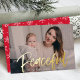 Carte de vacances moderne avec votre photo horizontale avec "Paiseful" affichée dans une feuille d'or lettrée main brosse de script. Personnalisez la carte de vacances en papier peint en ajoutant votre nom et l'année. Le dos de la carte est muni d'un motif de flocon rouge et blanc.