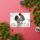 Carte de vacances photo "Mer et Salutations" mignonne avec un avant photo complet avec script "Mer et salutations" en papier d'aluminium, et votre nom et année. Deux mouettes chaudes encadrent votre photo. Le dos est de couleur sable doux et solide.