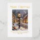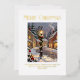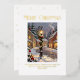 Merry Christmas, personalized greeting card with elegant gold foil typography. The design features a beautiful rendering of a snowy village scene with a seasonally decorated lamp post. The template is ready for you to personalize the greeting and add a text message.