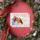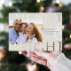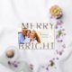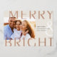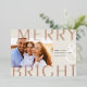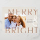 Une carte de vacances moderne avec une photo horizontale ou paysagère avec "Joyeux & Lumineux" recouvert d'une feuille d'or rose surdimensionnée. Personnalisez avec votre salutation de vacances personnalisée, le nom de famille et l'année. Un choix chic et moderne minimaliste pour vos voeux de Noël.