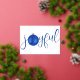 La carte de vœux utilise un ornement de Noël bleu avec des accents de feuille métallique réelle comme "o" (typographie) dans "joyeuse". L'option de changer l'or en argent ou en or rose est disponible. Le verso de la carte comprend l'adresse de l'expéditeur et le message.