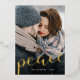Cet élégant carte photo de vacances dispose d'une photo verticale ou portrait orientée en fond saigné, avec "peace" superposé en écriture de feuille d'or. Personnalisez avec vos noms et l'année le long du bas en lettres blanches. La carte revient à un motif écossais rouge et vert en hiver.