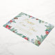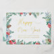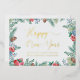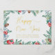 Elégante Carte de Nouvel An avec typographie de feuille d'or de luxe, personnalisée avec votre message et nom(s). Cette aquarelle a une belle bordure de feuillage et de verdure hivernaux, avec des cônes de pin, des fleurs, des saints et des baies sur le devant et, une forêt de sapins sur le dos. Joyeux Noël est écrit à la main dans la calligraphie tourbillonnant et votre texte personnalisé est imprimé dans la typographie moderne.
