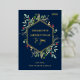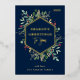 Ces magnifiques cartes de fin de année non photo disposent d'un cadre géométrique en feuille d'or assorti de feuilles dorés, d'une élégante verdure de Noël et de baies rouges sèches sur un arrière - plan bleu marine foncé sans photo. La typographie à la mode du papier doré dit "Bonnes Fêtes pour vous". Il y a de la place pour un message personnel à l'arrière.