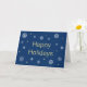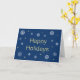Une carte de vœux classique et intemporelle pour tout le monde ! Joyeuses Fêtes en or. Flocons de neige blancs et dorés. Fond bleu foncé. À l'intérieur de la carte, entièrement personnalisable, figurent les éléments suivants : "Nous vous remercions sincèrement pour votre confiance. Nous vous souhaitons tout le meilleur pour cette période des fêtes." Suit le nom de l'entreprise et l'adresse du site web de l'entreprise.