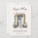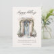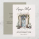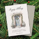 Carte de vœux à plat avec écriture moderne "Joyeuses Fêtes" et image de porte d'entrée décorée de verdure festive à l'aquarelle avec espace supplémentaire au dos pour message personnel