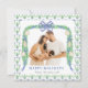 Carte de vœux Grandmillenial Coastal Blue Chinoiserie One Photo Carte de vacances Cette belle carte de vacances photo présente un cadre de verdure à l'aquarelle pour une photo. Le cadre est fait de ruban aquarelle bleu avec des ornements de Noël de style chinoiserie et de la verdure autour du cadre avec un nœud de Noël. Le verso de la carte présente de la verdure avec des arbres de Noël et des guirlandes.