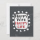 Le texte gras "Happy Wife Happy Life" est centré sur un arrière - plan gris. Le texte noir et rouge est posé sur un rectangle blanc avec de grands points blancs texturés autour, offrant un contraste ludique sur le fond de couleur solide.