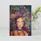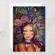 une représentation fantaisiste montre une personne souriante parée d'une couronne vibrante de fleurs et de feuilles. Le fond présente des motifs tourbillonnants qui ajoutent à l'atmosphère animée et joyeuse