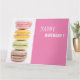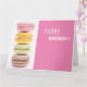 Prise de vue de macarons colorés et délicieux empilés dans des tons pastel. Pris en lumière et ambiance amicale sur un fond blanc et délimité à droite par un cadre teinté de rose. L'inscription Joyeux Anniversaire est mise en valeur en écriture blanche correspondant au fond des macarons à partir du cadre rose. Design moderne, lumineux et amical.