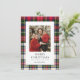 La carte de vœux moderne classique à tartan à photo unique pour les fêtes présente deux motifs à tartan et une photo dans des nuances de rouge, de vert et de marine.