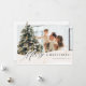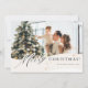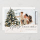Bannière de vacances moderne couleur crème et blanc cassé avec « Joyeux Noël » dans une police noire subtile, des accents de paillettes dorées et un emplacement pour une seule photo. Le verso présente une scène de Noël hivernale fantaisiste à l'aquarelle.