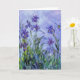 Carte de voeux Monet Lilac Irises. Peinture à l'huile sur toile de 1917. Monet a peint des iris tout au long de sa carrière, c'est un de ses derniers tableaux d'iris et certainement l'un de ses plus hantants. L'oeuvre est fortement impressionniste et les iris violets foncés semblent presque flotter dans l'eau au-dessus de leur feuillage vert foncé, le ciel au-dessus est bleu doux et violet. Un beau cadeau pour les amateurs de Claude Monet, d'impressionnisme, de peintures d'iris et d'art français.