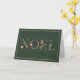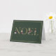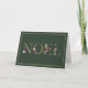 Une carte de voeux de Noël élégante avec un texte magnifique qui détaille NOEL et agrémenté d'aquarelle florale en bordeaux, bleu et rose pâle. Une bordure en or dessine le bord extérieur de la carte avec un riche arrière - plan vert chasseur. Un exemple de texte est inclus dans l'intérieur de la carte qui peut être personnalisé avec votre propre libellé ou conservé tel quel.